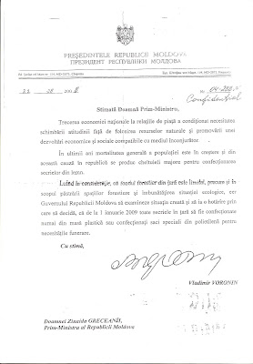 Liderul AMN, Serafim Urechean a prezentat astazi in fata deputatilor, dar si a jurnalistilor o copie a unei scrisori semnata de catre presedintele Vladimir Voronin si expediata premierului Zinaida Greceanii.